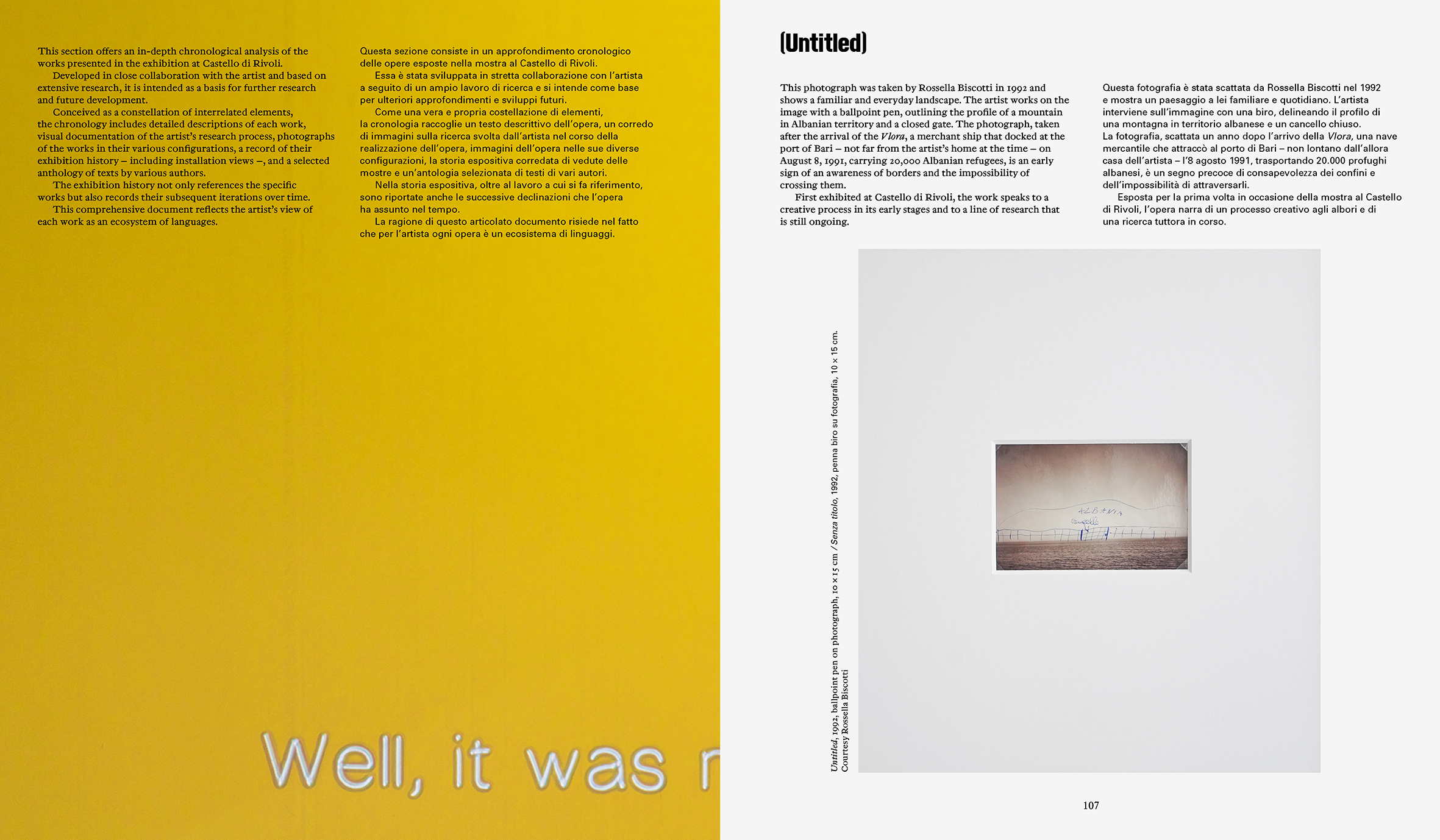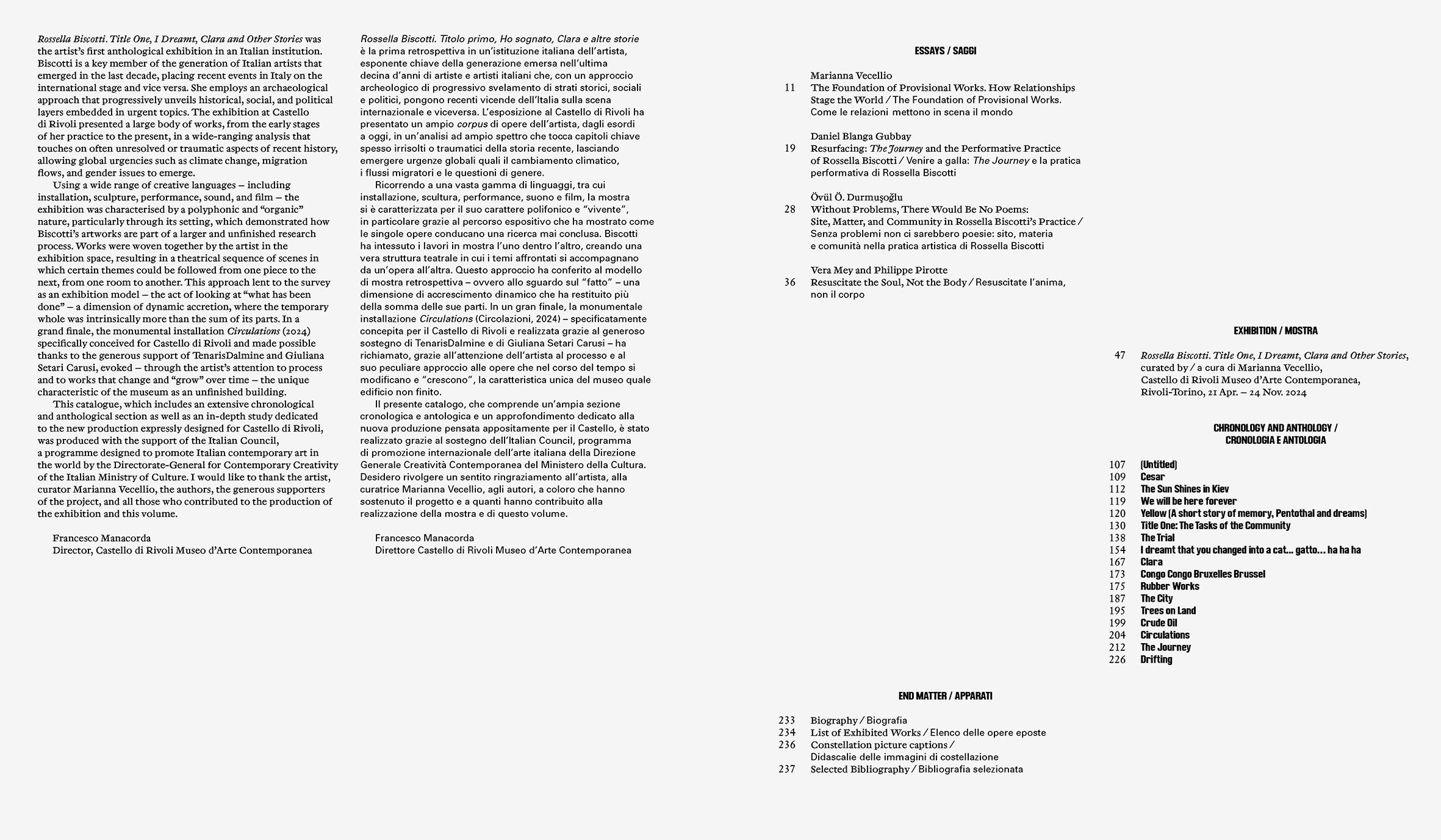 This is a retrospective catalogue of an eponymous 2024 solo exhibition of the Italian artist Rossella Biscotti at Castello di Rivoli. It comprises three main sections: essays, installation views, and complex accounts of each project in the show that draw together research material, exhibition history, and fragments of writing about the work.