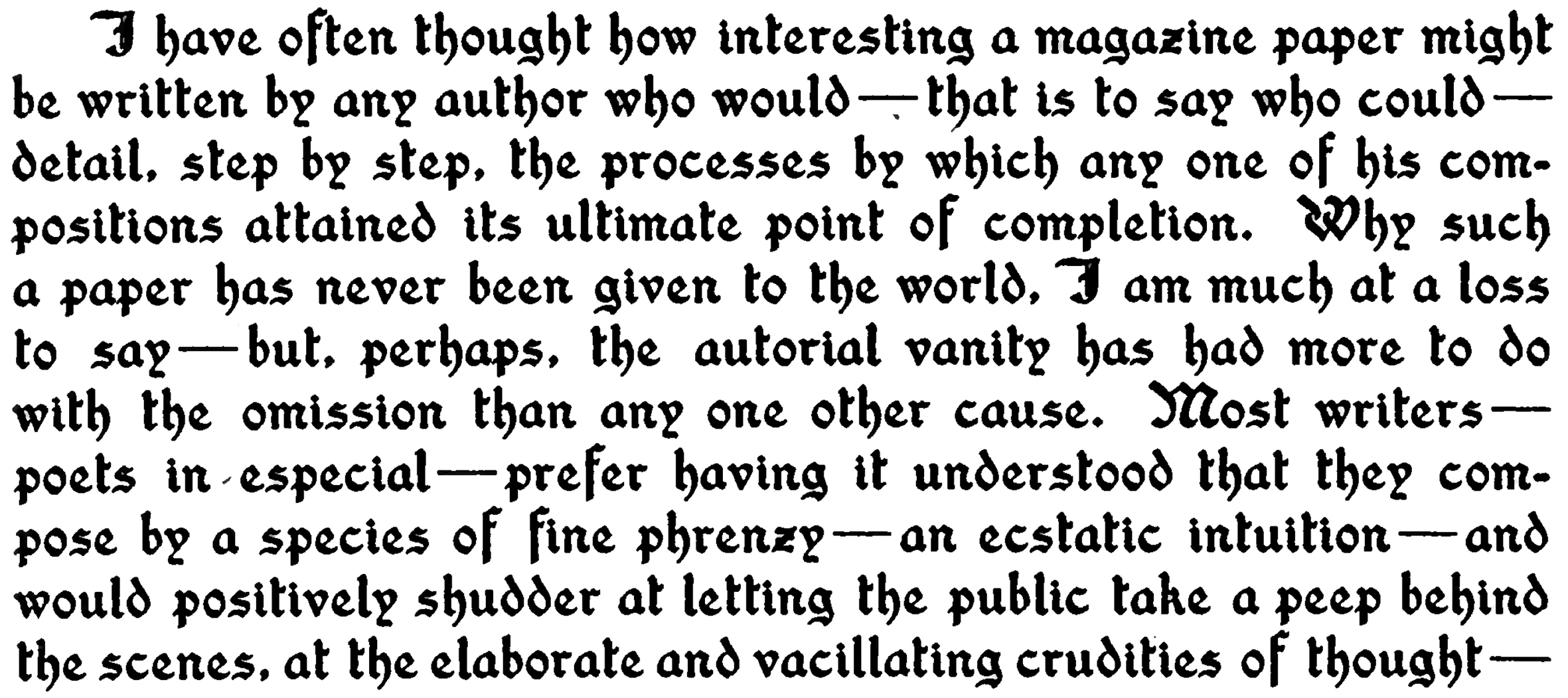 I have often thought how interesting it would be to read an article written by any author who would – indeed, who could – detail, step by step, the processes by which any one of their compositions reached its final state. I find it hard to understand why such an article has never been offered to the world, but probably authorial vanity has more to do with it than anything else. Most writers, especially poets, prefer people to imagine that they compose in a kind of inspired frenzy, an ecstatic intuition, and would shudder at the idea of letting the public take a peek behind the scenes at the elaborate and vacillating crudities of thought; at the true purposes seized only at the last moment; at the innumerable glimpses of ideas that arrived in an immature state; at the fully matured whims discarded in disrepair as unmanageable; at the cautious selections and rejections; at the painful erasures and interpolations – in other words, at the wheels and pinions, the scene-shifting equipment, the stepladders and trapdoors, the cock’s feathers, the red paint, and the black patches which, in ninety-nine cases out of a hundred, constitute the precarious mechanisms of the literary machine.