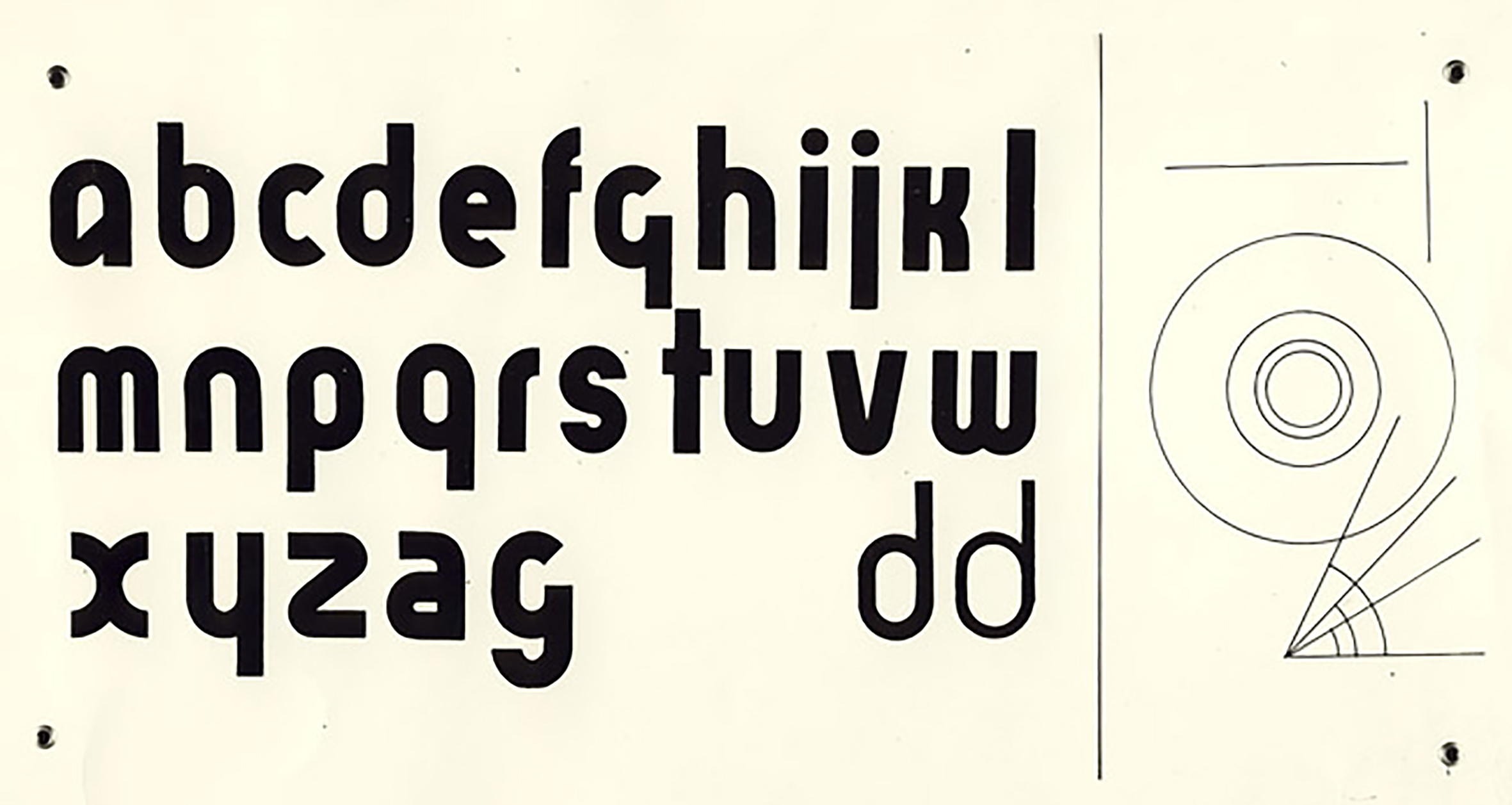 This latter characteristic reminds me of a couple of typographic siblings. The first is a small postcard-sized panel by the Austrian polymath Herbert Bayer demonstrating his 1925 Universal Alphabet, a pared-down sans-serif comprised exclusively of lower-case characters. Bayer adapted the basic glyphs for typewriter and handwriting, experimented with phonetic alternatives, and proposed a wide family of variants. Within the confines of the card, alongside the basic character set of its condensed bold version and allusion to other weights, he has also abstracted the tools used to draw it: ruler, T-square, set-square, compass, and protractor. In this way, the drawing effectively captions itself, pointing to its point – that this is a project intrinsically concerned with a particular mode of construction.