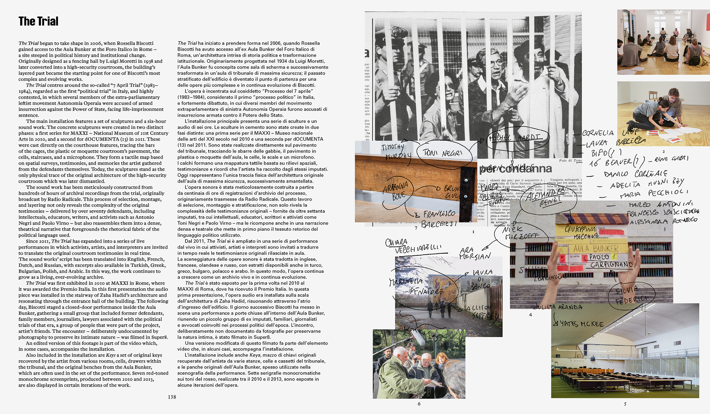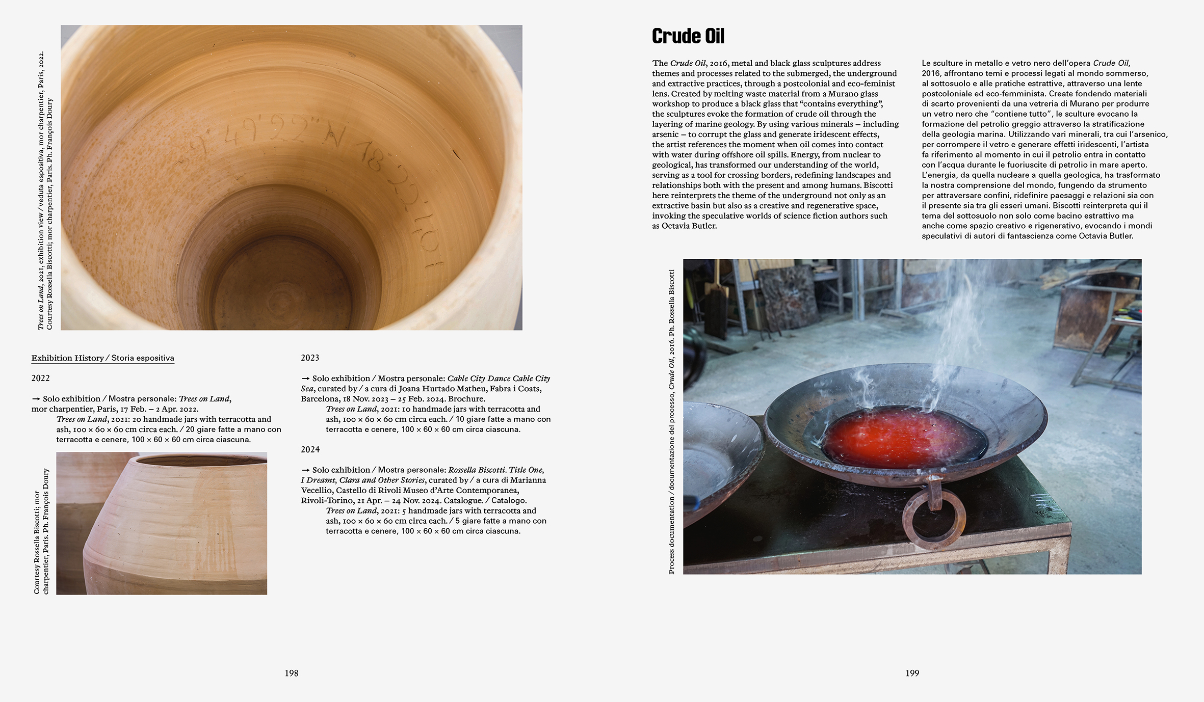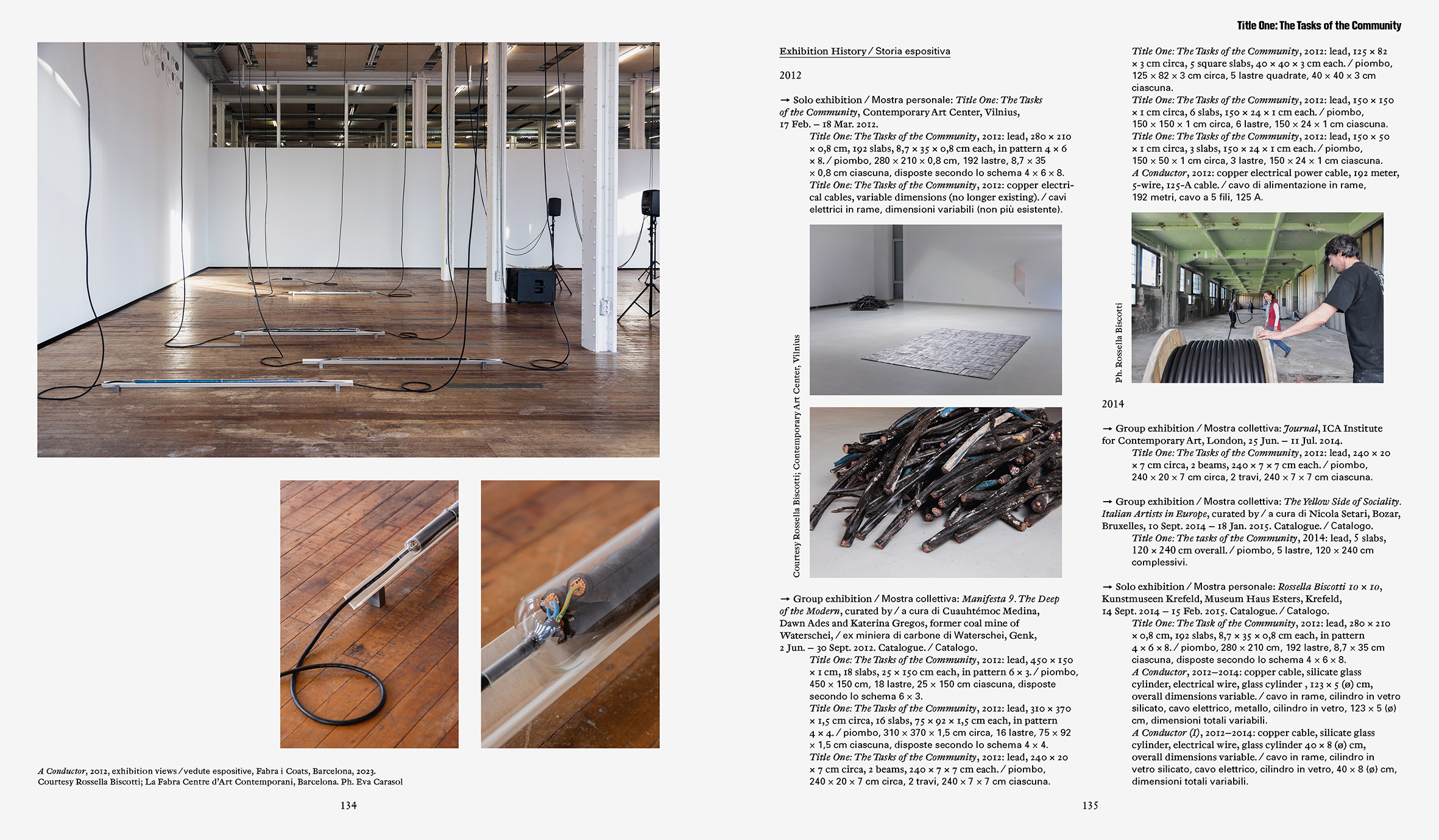 This is a retrospective catalogue of an eponymous 2024 solo exhibition of the Italian artist Rossella Biscotti at Castello di Rivoli. It comprises three main sections: essays, installation views, and complex accounts of each project in the show that draw together research material, exhibition history, and fragments of writing about the work.
