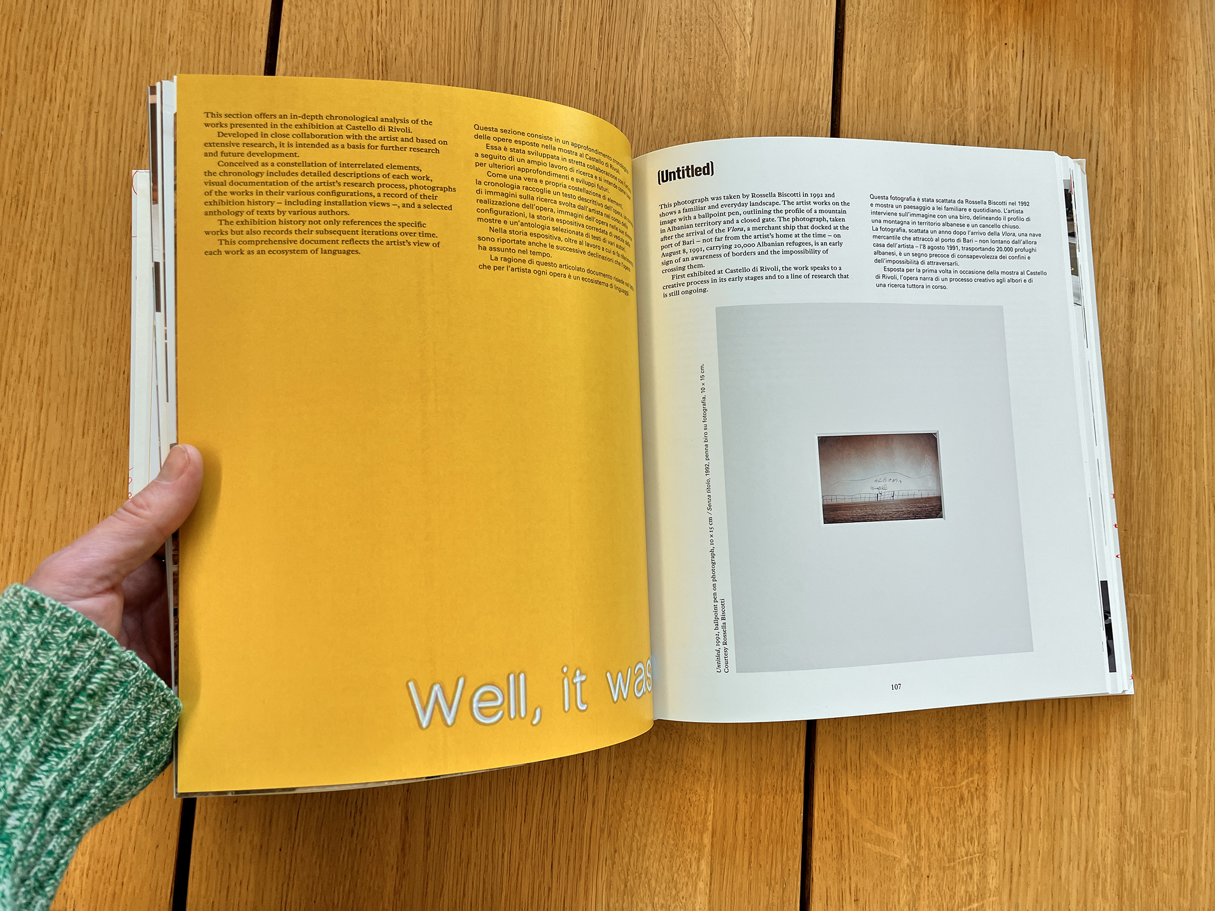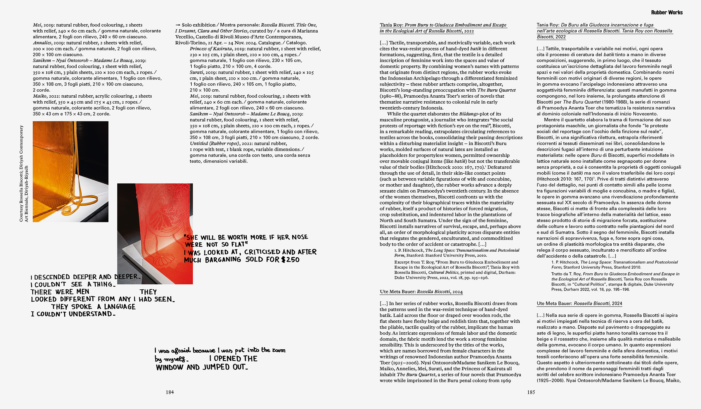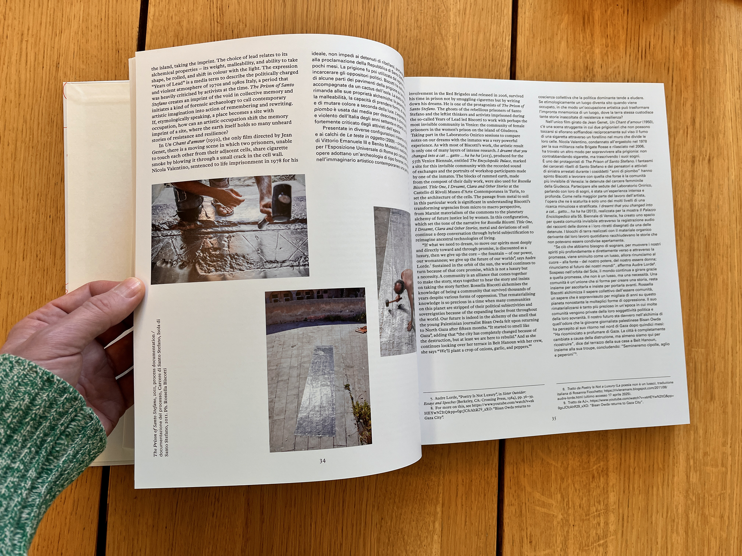 This is a retrospective catalogue of an eponymous 2024 solo exhibition of the Italian artist Rossella Biscotti at Castello di Rivoli. It comprises three main sections: essays, installation views, and complex accounts of each project in the show that draw together research material, exhibition history, and fragments of writing about the work.