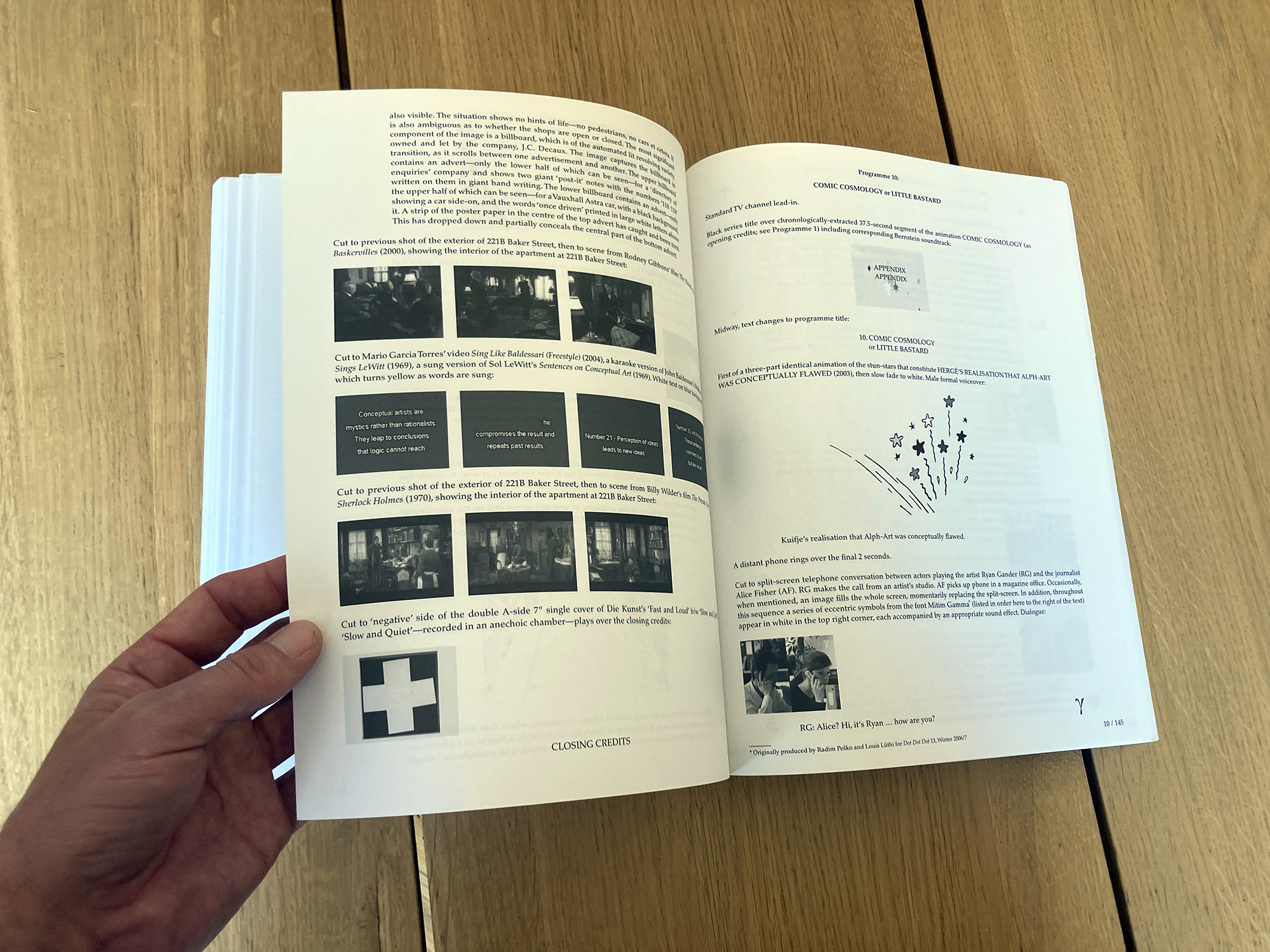 A few years after this book’s predecessor, we started working on a follow-up. In the meantime Ryan’s work had branched out into sound and video, which we attempted to collect and embody here via the conceit of scripting a TV series. The works are interspersed with a vast number of reference material from TV and film, occasionally helped along with voiceovers and subtitles.